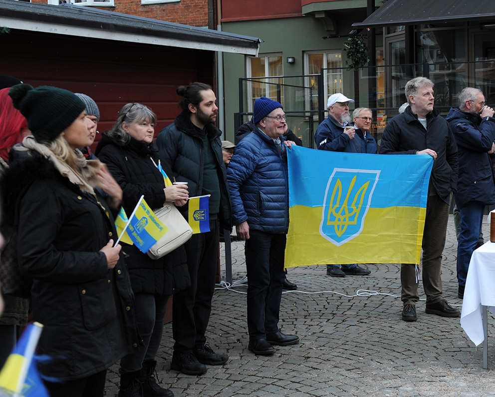 Runtom i Sverige manifesterades treårsdagen, så också i Hässleholm. Här hade ett hundratal, kanske tvåhundra människor samlats på Stortorget. Lokala politiker höll tal och sa det som under dessa tre år upprepats så många gånger. Ukraina måste få fred på sina villkor och såväl landet självt som övriga Europa måste sitta med vid förhandlingsbordet. Detta i motsats till Trumps intentioner att göra upp i samförstånd med Putin och helt enkelt dela upp den här delen av världen sinsemellan.