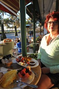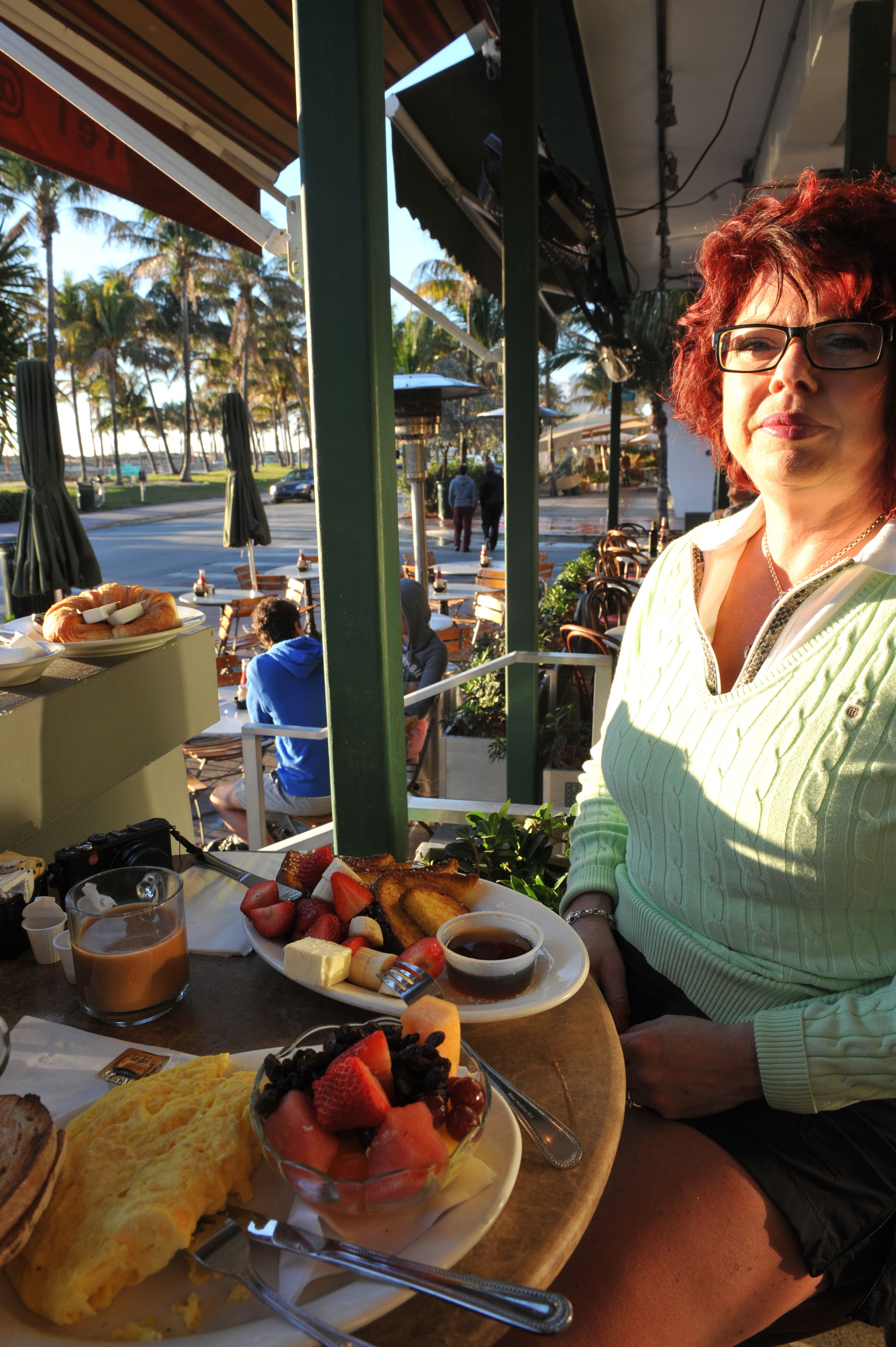amerikansk ostkust. Vi ger oss ut i den tidiga morgonen och promenerar ner till stranden. Vi kommer lagom dit för att njuta av soluppgången, ta några bilder och sedan fortsätta ner längs Ocean Drive till det välkända News Café. Här sitter redan många och intar sin frukost. Vi gör det samma. Vi får ett bord och matsedeln som är något större än bordet. Vi har varit i USA förr, flera gånger men minnet är kort. Därför beställer vi en omelett, en skål frukt, French Toast och en bagel. Beställningen avlutas med kaffe och ett glas juice. Vi njuter av den uppgående solen. Vår beställning kommer in. Jag undrar förresten om vi inte beställde en croissant också – vi har ju ändå semester. Tallrikar, glas och koppar får inte plats på bordet. Kyparen trodde förmodligen att det skulle komma fem personer till eller att vi skulle äta oss riktigt feta. Just det, vi är i USA. Där beställer man en rätt – ”to share”. Vi har har varit med om det förr men tycks alltid glömma att det är välgörande både för kropp och plånbok. Frukost för 350 spänn, allt var gott och vi blev mätta.