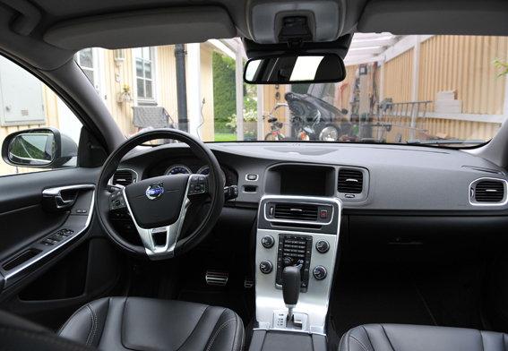 Ratten gillar jag, lite tjockare och behaglig att hålla i. Jag tycker att ratten i S80:n är för tunn, på gränsen till vass. Navigation och övriga funktioner visas i en integrerad skärm högst upp på mittkonsollen. Det är en snyggare lösning än den skärm som glider upp ur instrumentbrädan på äldre Volvo-bilar. Dessutom är V60:ns navigationslösning enklare att hantera än den modell som sitter i min S80. Med den tar det en kvart att programmera in ett resmål och att manövrera den under färd är förenat med livsfara, oerhört klumpig.