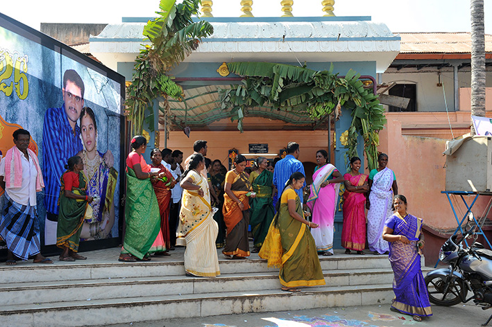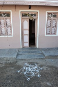 Nu äntrar vi åter våra jeepar och reser vidare in i Tamil Nadu. Strax kommer vi till en mindre stad där vi parkerar våra jeepar och beger oss ut på promenad i staden. Framför dörrarna målar man varje dag ett mönster med rispulver, vitt eller i färg. Det visar att huset är ”vid god hälsa” och är också välkomnande för besökare.