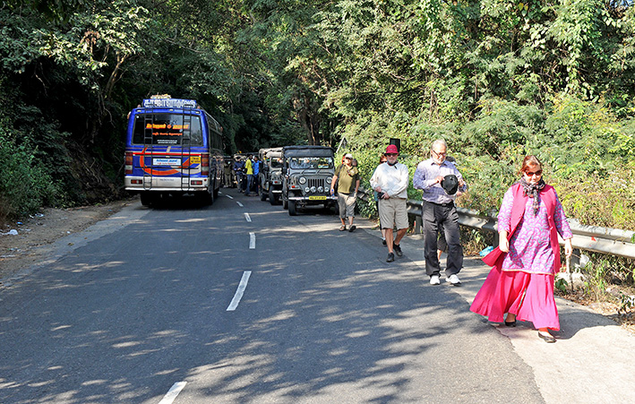 I nedförsbacken i en kurva stannar vår jeepkaravan. Vi ger oss ut på vägen till fots. Kaos uppstår när bussar, mopeder och bilar ska klämma sig förbi. Det eviga tutandet tilltar i intensitet men inte uppfordrande eller ilsket. Nej, bara för att tala om att ”här kommer jag – se upp!”.