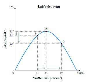 Skatteintäkterna ökar inte automatiskt bara för att man höjer skatt efter skatt. Tvärtom finns det en brytpunkt som innebär att alltför höga skatter är kontraproduktiva och ger lägre skatteintäkter till statskassan enligt den sk lafferkurvan. Vi befinner oss i Sverige idag sannolikt på fel sida (till höger) om lafferkurvans topp vilket innebär sjunkande skatteintäkter till staten.