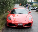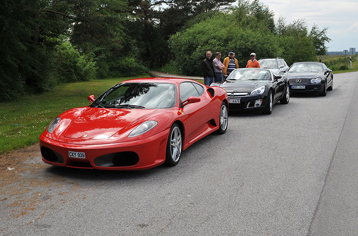 Efter vägen bytte vi bilar och förare om vartannat på vår väg mot första mål Trelleborg och sedermera Abbekås. Från Abbekås mot Skivarp var det min tur att ratta Ferrarin, en F430. En V8 väl synlig genom bakrutan sitter precis bakom ryggen i den tvåsitsiga bilen. Ljudet är underbart. Du sitter i stolar av kevlar och med röda fyrpunktsbälten. Man sitter som i ett skruvstäd för att använda en klysha. Växling sker med paddlar eller helautomatisk – men det senare är ju ingen sport, säger Rolf som äger bilen. Ganska snart hittade jag en liten raksträcka och olydig som jag är stannade jag Ferrarin för sen direkt trampa gasen i botten. Oj, oj vilket acc. Innan man vet ordet av har man gasat bort körkortet om man inte tänker sig för – men det gjorde ju jag så klart. Tänkte mig för alltså, eller… Ganska snart tvingas jag släppa. Vi är ju trots allt inte på någon racerbana och när som helst kan en bilist dyka upp nu när sikten inte längre är helt öppen.