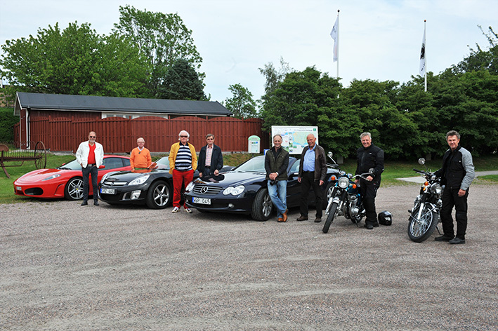 Så inför förra mötet kom vi överens om att samlas hos kamraten Rolf i Höllviken, ta med våra respektive fordon som kunde vara av intresse. Följaktligen kunde vi till detta möte som ägde rum på Nationaldagen mönstra en Bentley Continental, en Ferrari 430, en Opel GT och min egen Mercedes-Benz SL350. Dessutom två vintage motorcyklar av modell Honda CB750.