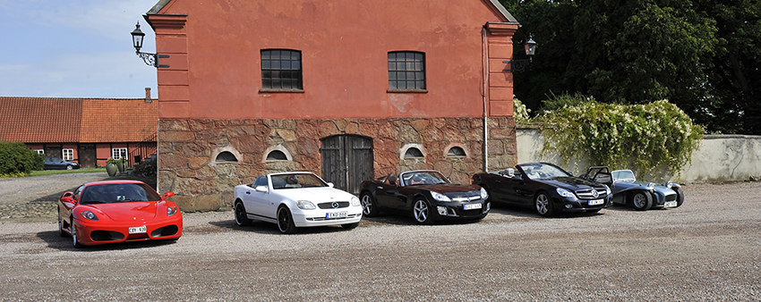 Vacker uppställning. Fr vänster Ferrari F430, Mercedes SLK230, Opel GT, Mercedes SL350, Lotus Super Seven. Brodda Stuteri.